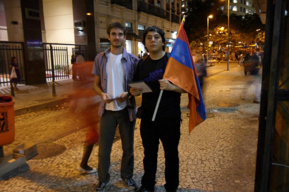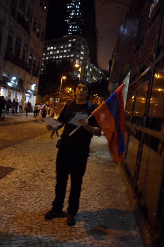 Saí da Igreja e voltei ao bairro onde moro, a Ilha do Governador. No caminho, dentro da VAN, conheci um engenheiro angolano que estudou na Rússia, reconheceu a bandeira da Armênia em minhas mãos e disse que esteve lá na época do início dos confrontos com os azeris. Ele, por ter passado uns meses na Armênia, conhece a nossa história e lembrou que aquele dia era mais um 24 de abril. Eis que dei a ele um panfleto sobre o genocídio, e deixei meu e-mail. Espero que ele entre em contato para que eu possa conversar mais com uma pessoa que estava na Armênia durante aquele período de heroísmo Armênio.