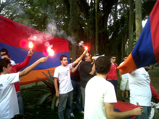 Cerca de 60 jovens de origem armênia e simpatizantes da causa se dirigem ao consulado turco de São Paulo para protestar pelo massacre de Um milhão e quinhentos mil armênios inocentes em 1915. Esses mártires eram bisavós e tataravós dos manifestantes desse ato.