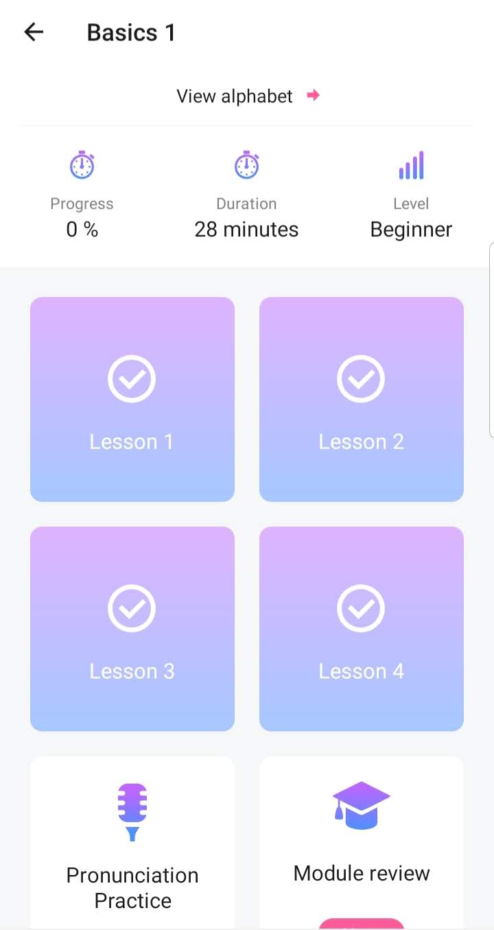 Os exercícios dividem-se em 31 módulos com temas diferentes e variam entre associação de imagem e palavras, “quebra-cabeças” de frases e pronúncia por gravação de voz (apesar de esse último não analisar de fato a voz para saber se a pronúncia está correta).