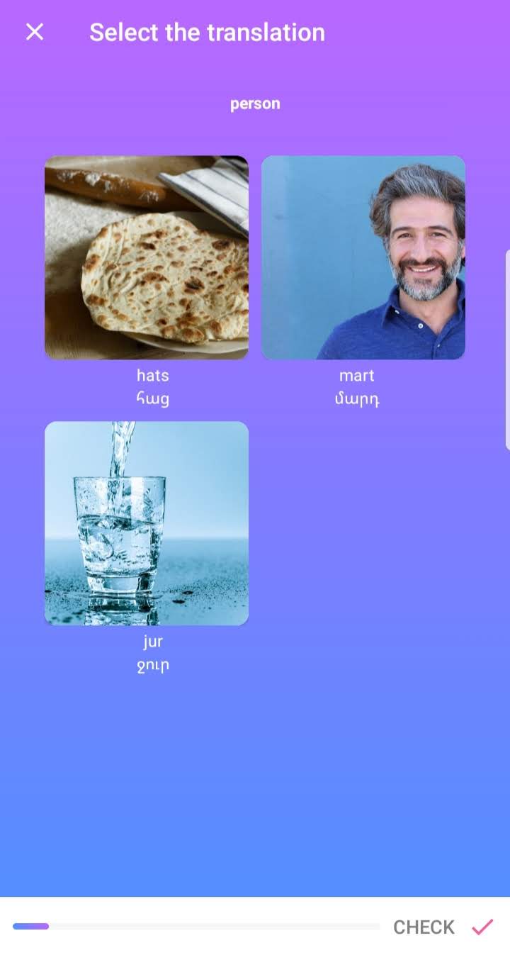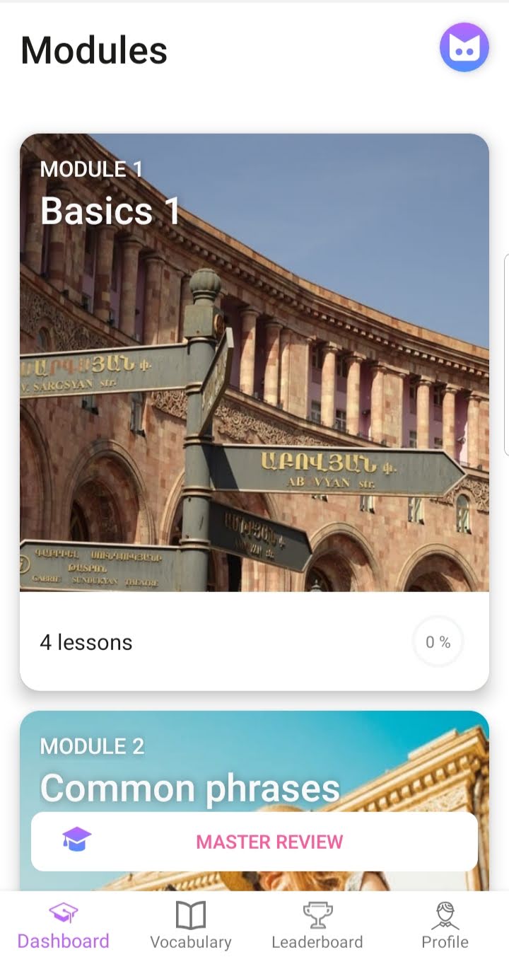 Aprender armênio significa ter que aprender também o alfabeto armênio. O aplicativo não se propõe (pelo menos até aonde eu avancei) a testar o aprendizado do alfabeto, apesar de todas as palavras estarem escritas no alfabeto original e também transliteradas pro nosso alfabeto e a conversão de alfabetos estar sempre à mão entre as aulas.