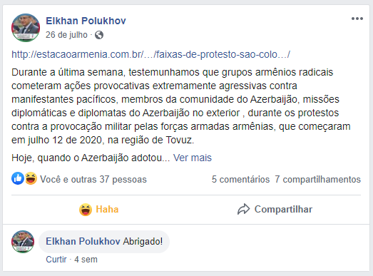 Polukhov afirma em sua postagem que “São mais de 100 mil armênios no Brasil e apenas 5 azerbaijaneses (sic)! Mas nós estamos aqui.” O diplomata tem publicado artigos nas colunas de “opinião” de pequenos blogs e jornais, tentando construir uma narrativa de agressão armênia. Além disso, Polukhov tem utilizado o Portal Estação Armênia como fonte para promover seus ataques, compartilhando posts e comentando na página do Portal no Facebook.