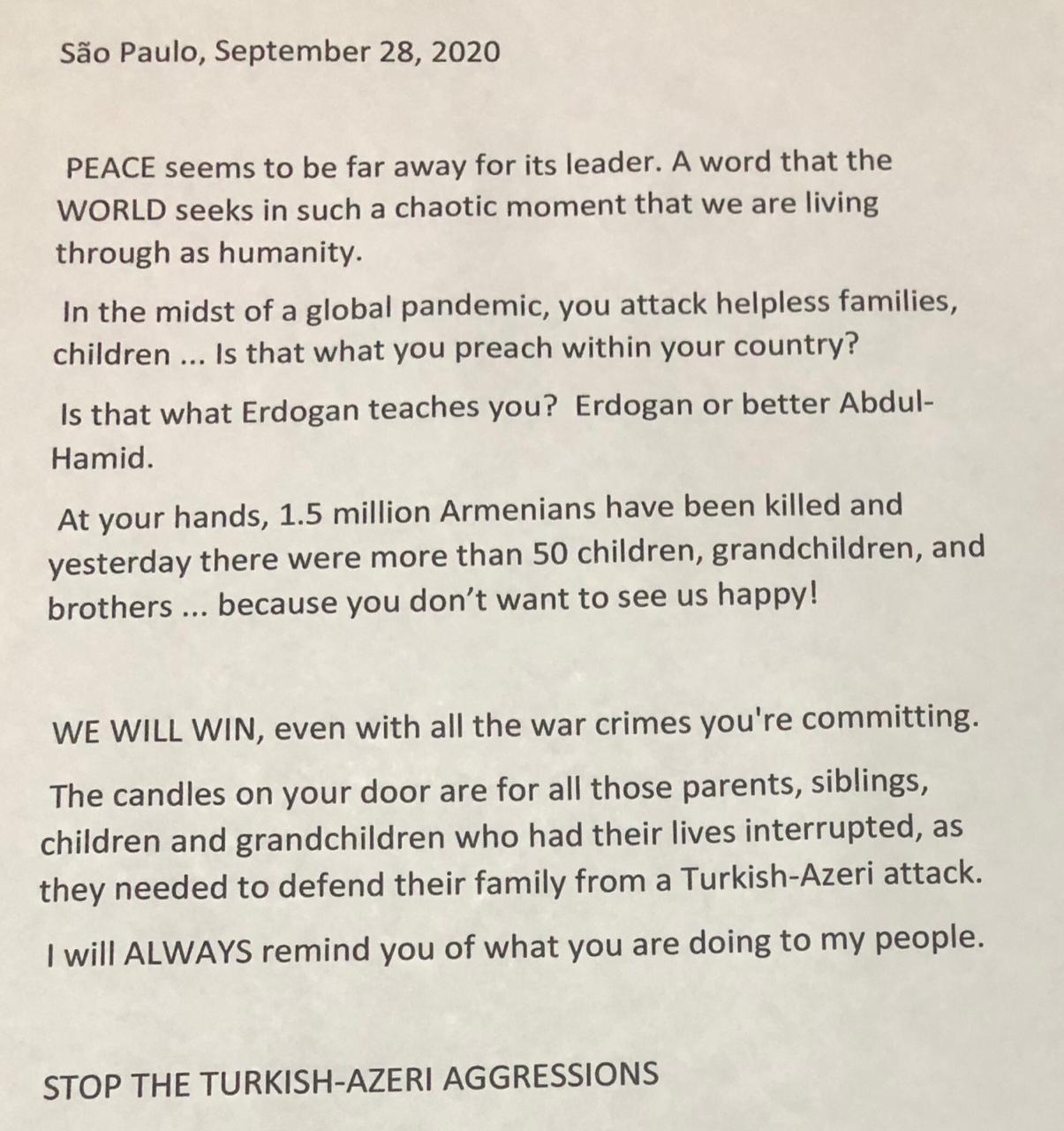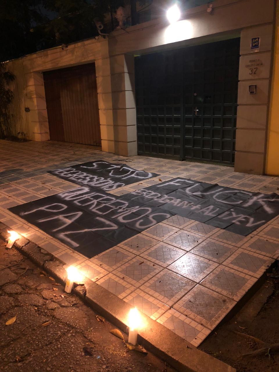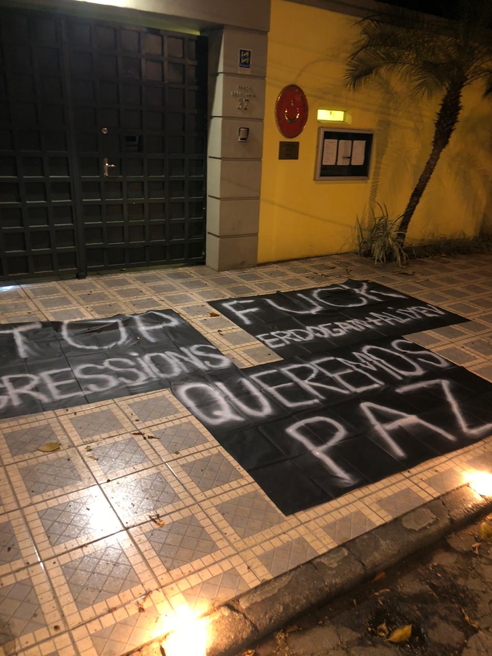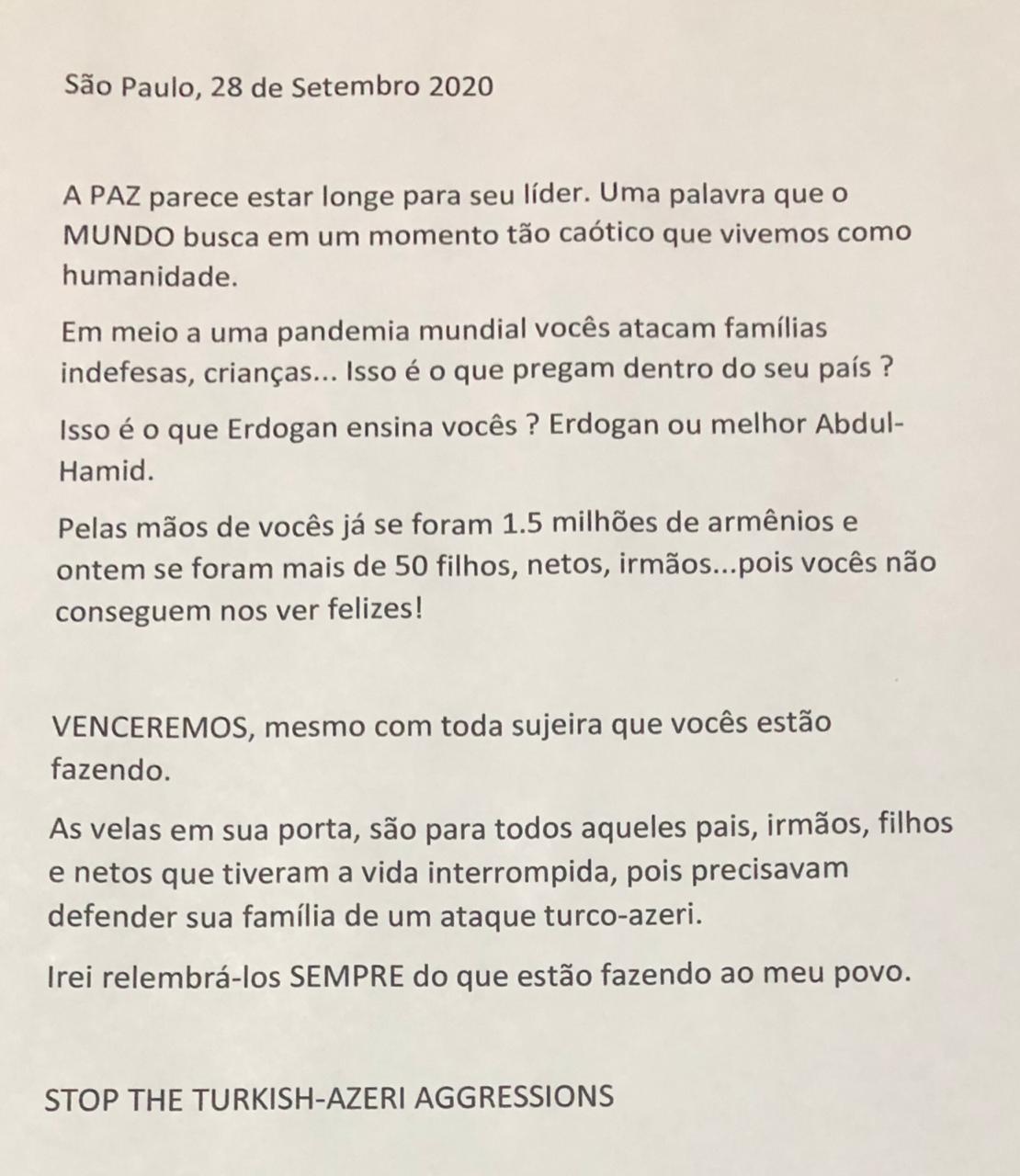 Na noite desta segunda, dia 28 de setembro, novas faixas foram colocadas em frente ao Consulado da Turquia em São Paulo em reação aos ataques que o Azerbaijão realizou à Artsakh na manhã do último domingo. Faixas já haviam sido colocadas no Consulado no ataque do Azerbaijão à Tavush em julho deste ano.