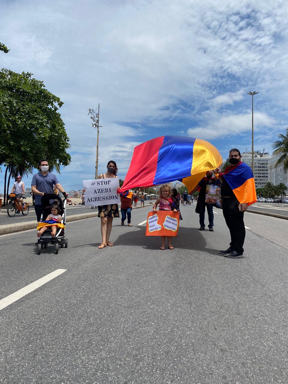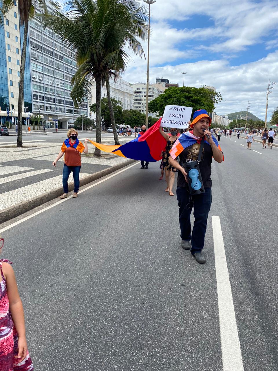 Os manifestantes caminharam pela orla da Av. Atlântica com uma bandeira gigante da Armênia e caixa de som alertando os passantes sobre os ataques azeris e turcos à população civil de Artsakh e da Armênia.